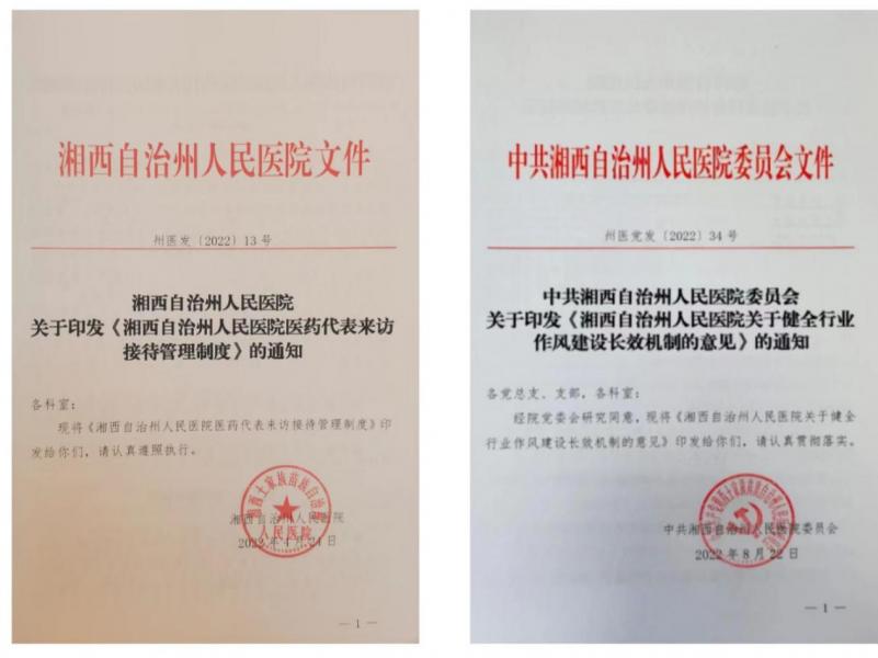 我院坚持以患者为中心,以质量为核心,以患者满意为尺度,持续纠治医药购销领域和医疗服务中的不正之风,先后制定下发了湘西自治州人民医院《纠正行业不正之风管理规定》《纠正医药购销领域和医疗服务不正之风专项治理工作方案》《医务人员廉洁从业行动方案(2021—2024年)》,《医药代表来访接待管理制度》等规定。锲而不舍地坚持开展药品耗材、重大设备采购自查自纠工作,集中开展高值医用耗材重点治理、打击“红包”和回扣专项整治。2019年,在州纪委的直接指导下,抽调专职人员对全院各临床医用耗材及药品使用情况进行了内部自查,以壮士断腕的勇气,坚决纠正了2000余万元的违规资金上缴本级财政。